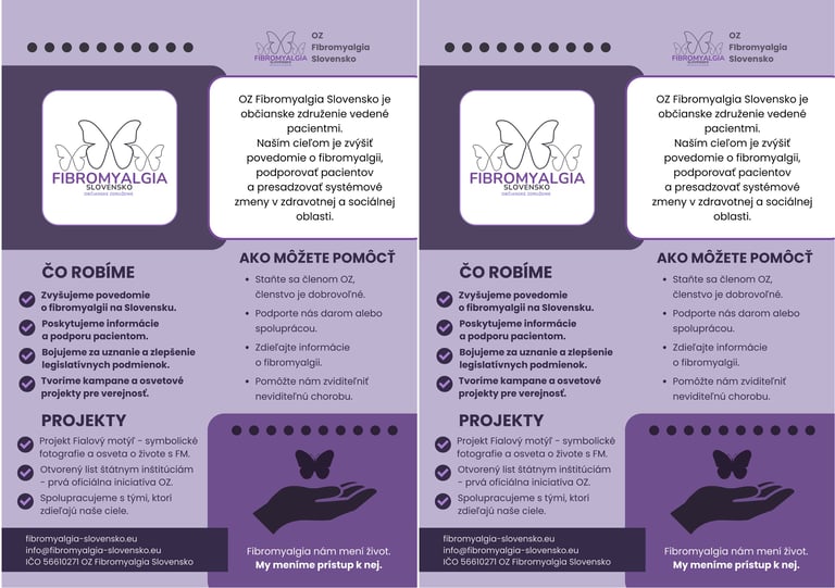 Leták OZ Fibromyalgia Slovensko, ktorý si môžete vytlačiť (i čierno-bielo) a vziať so sebou do čakárne, lekárovi, na nástenku, apod.