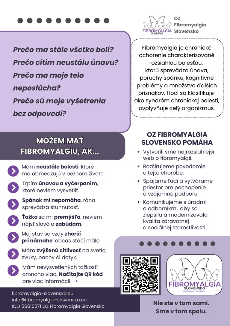 Tento leták vznikol pre ľudí, ktorí už dlhší čas hľadajú odpovede na svoje nevysvetlené bolesti, únavu či zhoršujúci sa zdravotný stav. Diagnostika fibromyalgie na Slovensku trvá často roky, pričom mnohí pacienti ostávajú bez informácií a podpory.