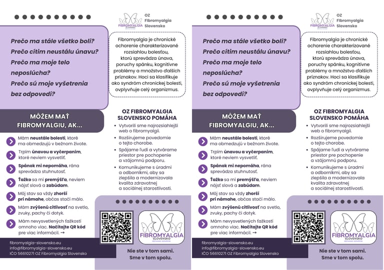 Pozývame každého, komu na tejto téme záleží, aby nám pomohol šíriť informácie o fibromyalgii. Stiahnutím, vytlačením a zavesením letáka v čakárni, na nástenke polikliniky či v lekárni sa môžete stať priamym pomocníkom pacientov na Slovensku. Aj jeden leták na správnom mieste môže niekomu zásadne skrátiť cestu k diagnóze a poskytnúť pocit, že v tom nie je sám.